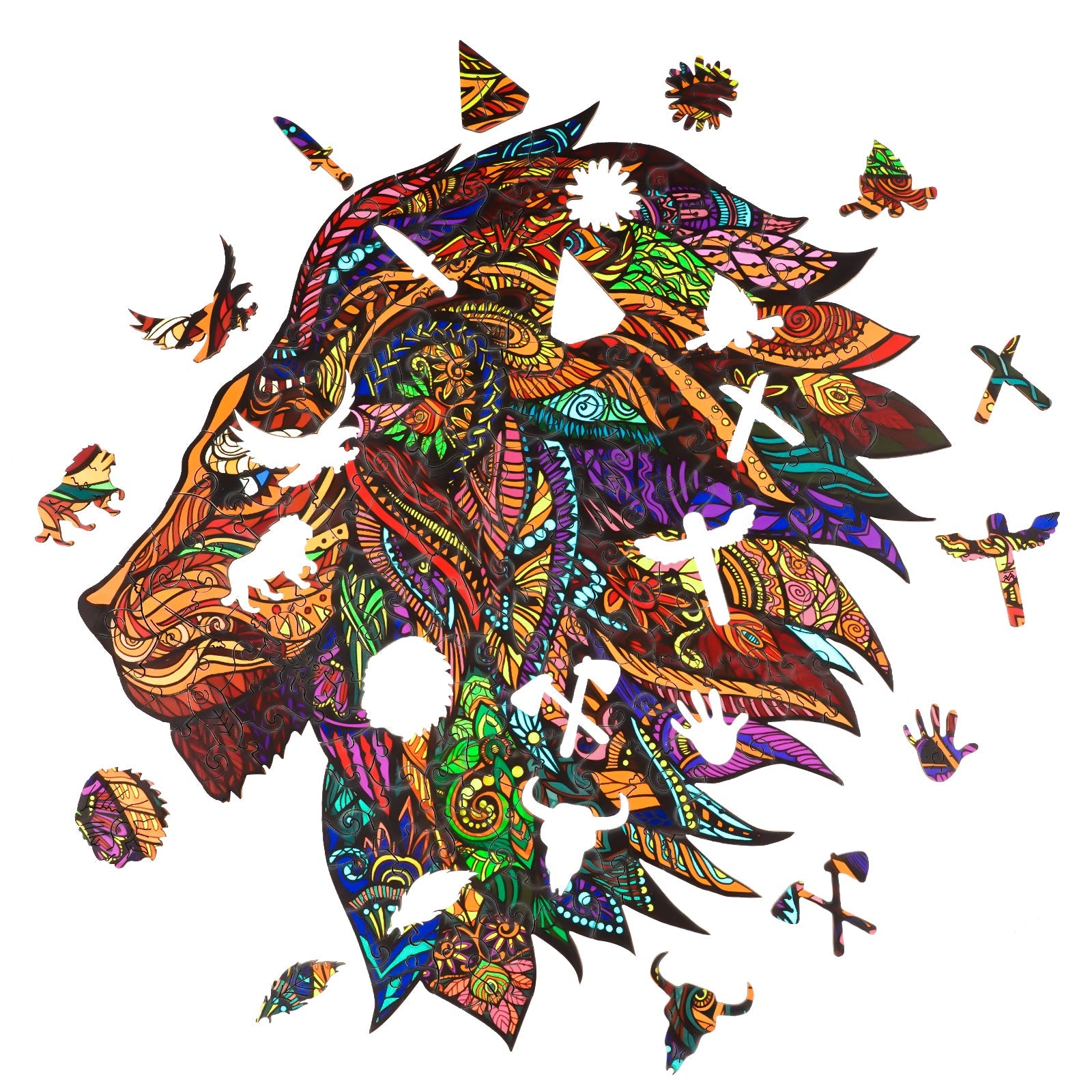 Die intensive Beschäftigung mit den kleinen Holzteilen hat eine spürbar meditative Wirkung. Du tauchst ganz in die Puzzle-Welt dieses wilden Löwen ein und begibst dich auf seine Spuren unter der Sonne Afrikas. Nach und nach setzt du die einzelnen Puzzleteile zu einem feurig-changierenden Motiv zusammen, das du so lebendig werden lässt. Unter deinen Händen erwacht ein majestätischer Löwe voll Anmut und Eleganz, der mit jedem weiteren Puzzleteil immer farbenprächtiger wird. Das Außergewöhnliche dieses Holzpuzzles besteht in den besonderen Puzzleteilen, die in Verbindung mit dem Löwen als Hauptmotiv des Puzzles stehen und sein Umfeld, seinen Lebensraum widerspiegeln. Lass dich überraschen, welche detailreichen Gegenstände und Symbole du entdecken wirst.