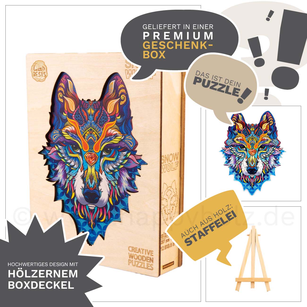 Ein Schneewolf als Holz-Puzzle für Dich oder als Geschenk Das einzigartige Schneewolf Holz-Puzzle wird in einer schönen Geschenkbox aus Holz geliefert. Diese ermöglicht eine geschützte Aufbewahrung. Kein Holzpuzzleteil geht somit verloren. Ein nachhaltig hergestelltes Schneewolf Puzzle aus Lindenholz (Hartholz) mit einer einzigartigen Farbgestaltung in besonders kräftig, leuchten Farben ist daher nicht nur für Dich eine Verlockung. Du kannst auch anderen damit eine Freude bereiten. Ob Kindern, Freunden und Bekannten oder älteren Menschen, die ihre Feinmotorik trainieren möchten, ein Puzzle aus Holz ist immer eine einzigartige Geschenkidee.