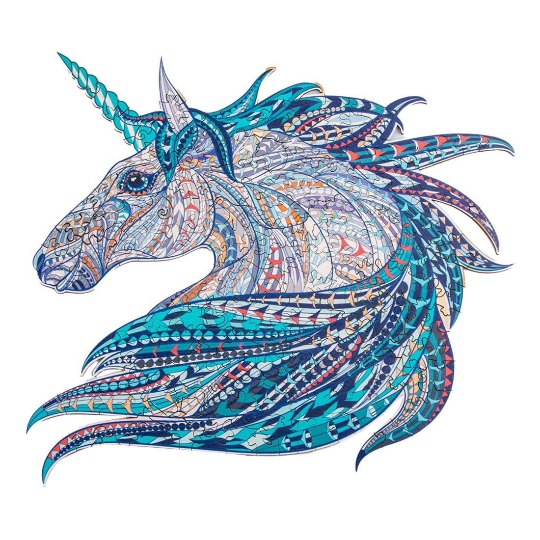 Tauche in die zauberhafte Welt des traumhaften Einhorns ein, das durch seine beruhigenden Blau- und Türkistöne hervorsticht. Zusätzlich dazu findest du Details in sanften Pastelltönen vor. Lasse dich von den besänftigenden Farben des Fabelwesens inspirieren, um den richtigen Platz der einzelnen Holzpuzzleteile zu finden. Das gesamte Puzzle besteht nämlich aus nicht rechtwinkligen Teilen und fördert deshalb umso mehr die kognitiven Funktionen des Gehirns. Dabei werden sogar beide Gehirnhälften stimuliert und trainiert. Du wirst direkt erkennen, dass einige Teile im Holzpuzzle aber auch eine ganz spezielle Form haben, die zur traumhaften Welt des Einhorns passen. So gibt es beispielsweise Puzzleteile, die selbst wie ein Einhorn aussehen. Beim Puzzlen des traumhaften Einhorns erwarten dich also immer wieder kleine Überraschungen, wenn du die märchenhafte Welt des Einhorns in den Teilen und deren Form selbst entdecken kannst.